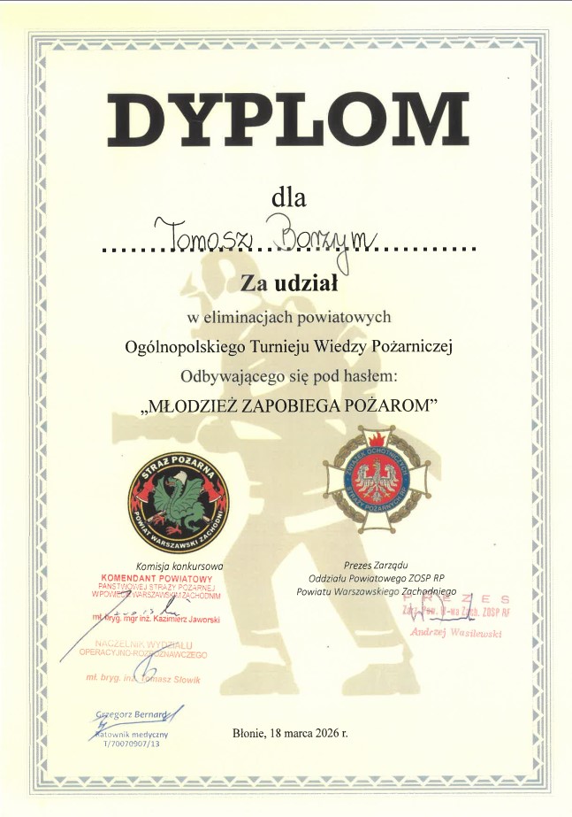 Z dumą informujemy, że Tomasz Borzym z klasy 6c reprezentował naszą szkołę w eliminacjach powiatowych Ogólnopolskiego Turnieju Wiedzy Pożarniczej Młodzież Zapobiega Pożarom.